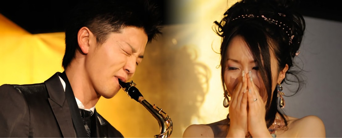 滑らかなやさしい音を奏でるサックスの演奏。驚く新婦。演奏が終わるころには、新婦もゲストの目にも涙がにじんでいた。